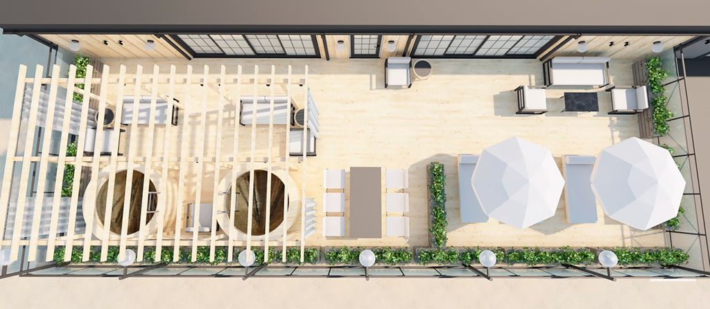 зону, шезлонги и озеленение.